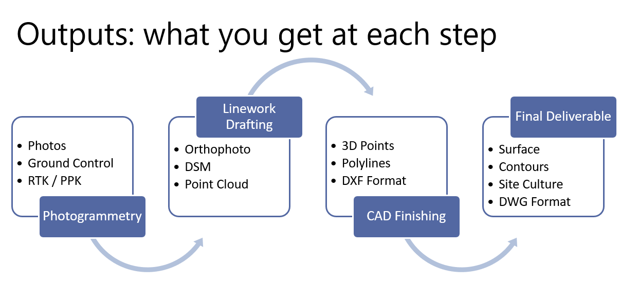 The purpose of this workflow is to go from drone photos to land survey deliverables in CAD. This means a single CAD file that contains: