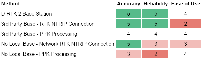Reliability: We want to know if this methodology and workflow will work on every project, every time. If a project can’t work on every project, it will rank lower on reliability. If software errors, network errors, or processing errors force a site to be re-flown or re-visited to gather additional data for any reason, it will rank lower on reliability.