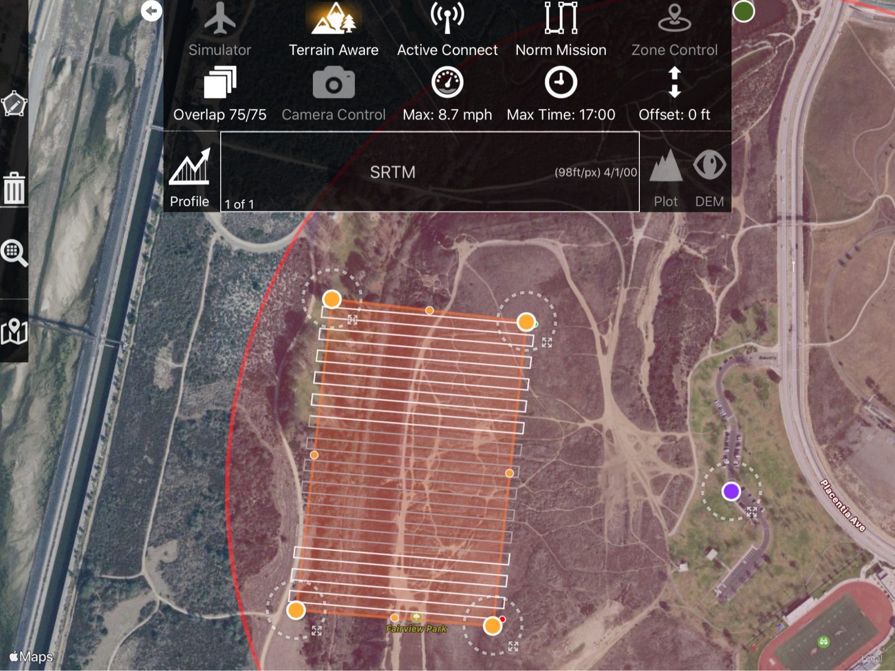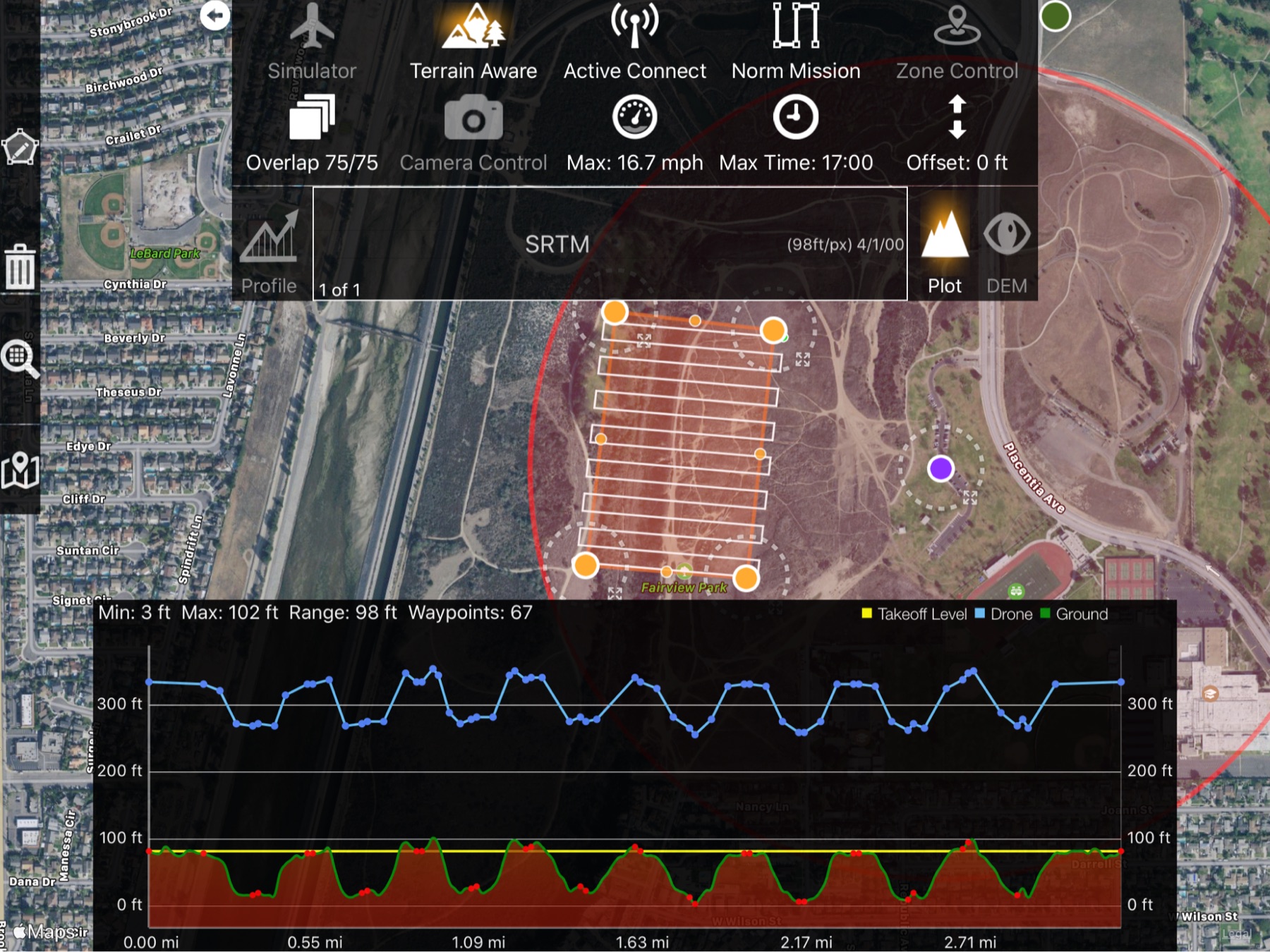 Once the software is done downloading the basemap for the site, use the “profile” button to see the waypoints the software created to follow the terrain.