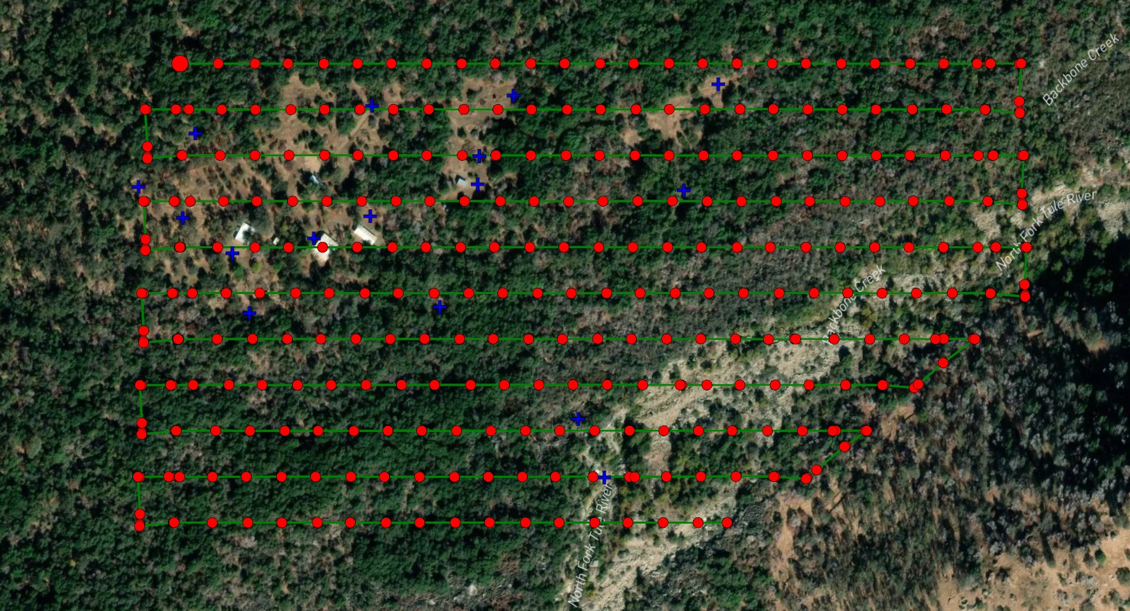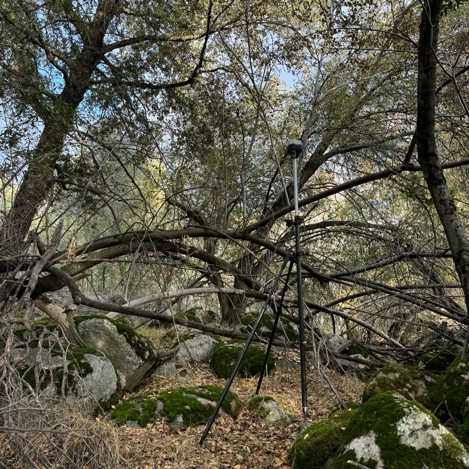 The project site was explicitly chosen for many reasons to be extremely difficult to survey. It is a private property located in a glacial valley in a very rural part of the central California mountains. As such, there is no available power or communications infrastructure, necessitating a workflow that can be reliable with no practical ability to recharge, update software, or utilize any form of cell-based RTK networks. Large portions of the site are effectively inaccessible due to dense vegetation, enormous boulders and rock walls often exceeding 10’ in height, and plenty of thorny brambles and poison oak to punish any surveyor who would dare attempt to measure the site on the ground.