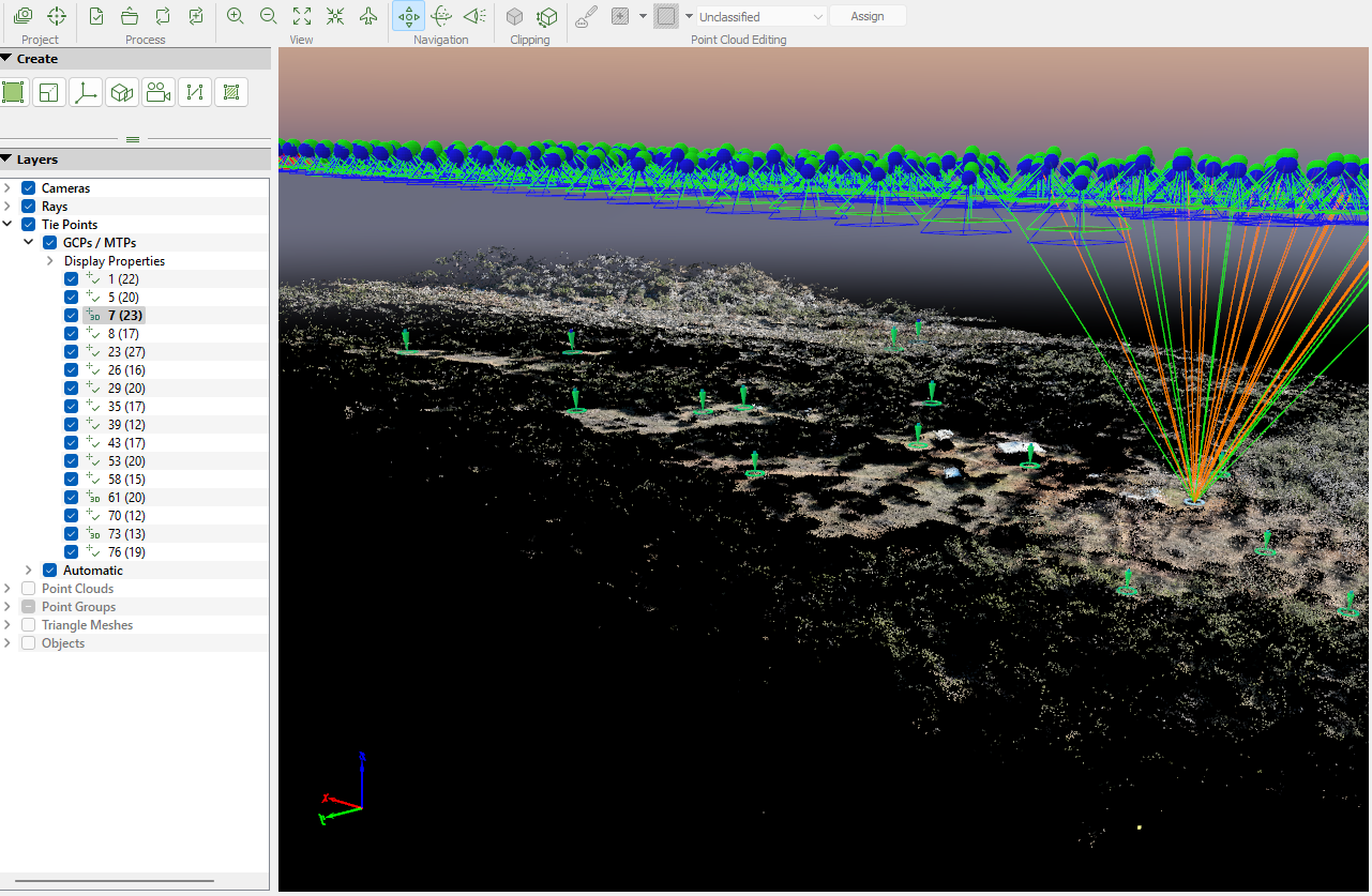 Given that the raw drone data was collected with a GPS base station set over an arbitrary point, it is necessary to georeference the lidar data before any accuracy measurements can be done. There are numerous ways to achieve this. This can be done by either post-processing the base station data itself, or aligning the point cloud to know marked targets. While either method is valid, we chose to use ground control points to ensure that photogrammetry data, ground data, and lidar data were all optimally aligned in the simplest workflow possible. From here, all work was performed in Global Mapper software.