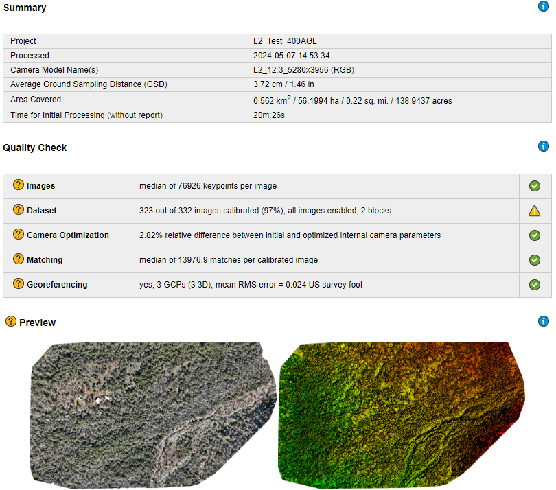 Overall, the L2 is absolutely capable of providing quality survey data at both 200’ and 400’ altitudes, and is a high quality sensor. But as with other sensors, there is no magic set of flight altitudes or settings that is right for every project. Whether it is flight altitude, overlap, sensor used, processing methodology, or number and distribution of ground control points, the number of possible permutations in each individual surveying project is simply too large to simplify into a single set of results.