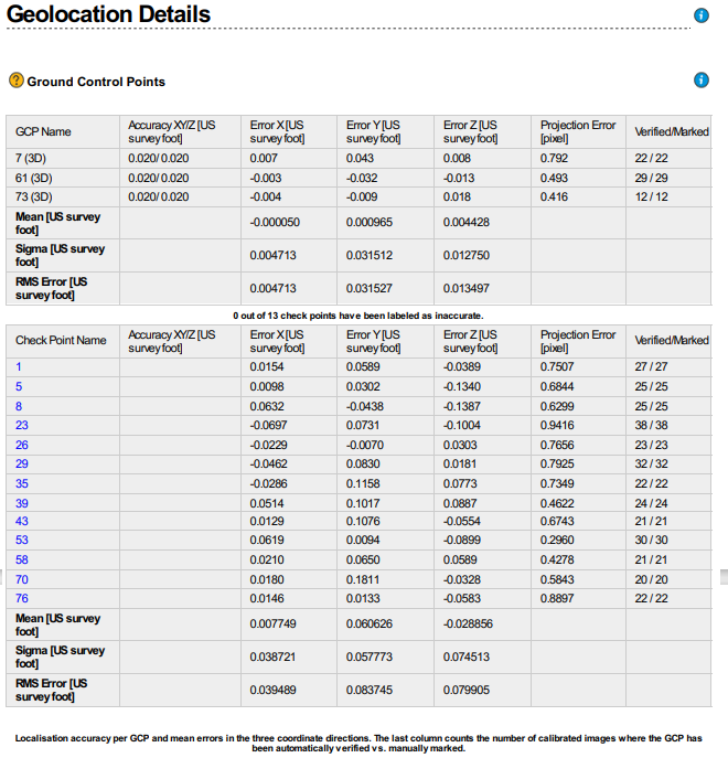 To simulate real world processing scenarios, each flight was photogrammetrically processed a single time with results measured after that single attempt. This is a deliberately limited scope intended to mimic how real world processing happens, including any and all errors that might only be detected after numerous rounds of advanced processing. In all 3 flights, 3 of the 16 marked targets were selected to be used as ground control points*, while the remaining 13 were used as checkpoints to measure the accuracy of the photogrammetric solution. The 3 ground control points are necessary both to properly calibrate the camera, as well as to translate the image geolocation to the right place. This is because the image geolocation measured using the DJI in-field software was calculated using a base station over an arbitrary location, which is an extremely common and robust workflow in photogrammetric processing.
