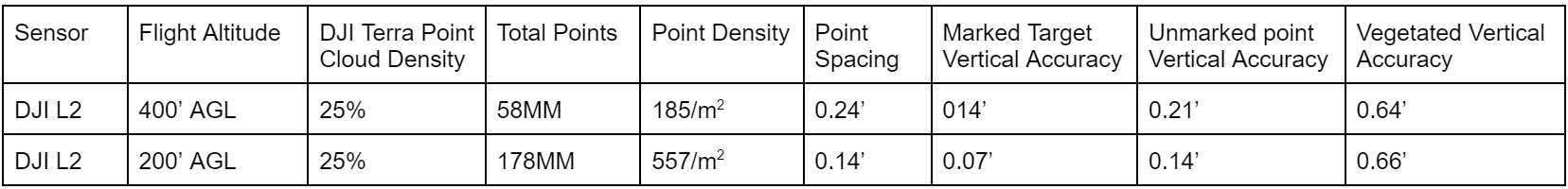 It is notable that vegetated vertical accuracy is not materially affected by the flight altitude, as both the 200’ and 400’ flights produced comparable vertical accuracy. A subjective analysis of the two different flights reveals that while the 200’ flight did produce higher point density, the actual penetration of vegetation was not materially different between the two flights.